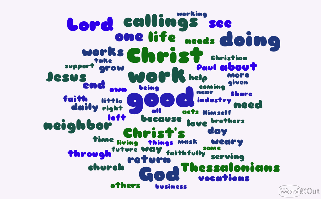 Doing good the 2 Thessalonians 3:13 way is not special doing good, making some sort of extra effort. What the Apostle is commanding is the rubber-hits-the-road work of living out our callings. Our callings have not significantly changed simply because we have been assured that the end of all things is drawing near. Our callings, our vocations, what the Lord has assigned us in light of the end, these callings are as significant as they ever were because we have as many vocations as we have neighbors to serve.