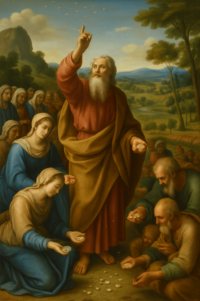 Moses says that God led Israel through the wilderness to test them. The purpose of His test was to lead Israel to trust Him more fully. So far, they haven’t been doing very well. It wasn’t long after God had led the Israelites to safety through the Red Sea that the little bit of food they had packed for themselves in Egypt ran out. They were hungry. There was no food for them to eat in the wilderness, just a lot of rocks and sand.