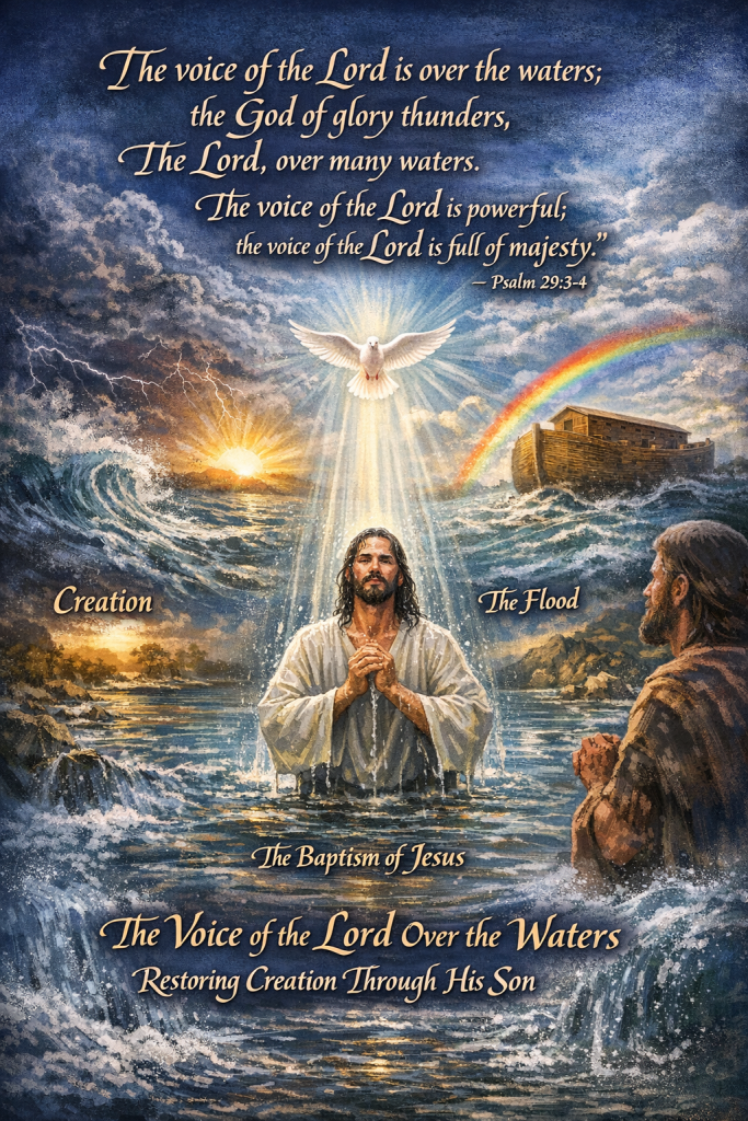 A common theme of our Psalm and Gospel for today, the Baptism of Our Lord, is the mention of the voice of the Lord over the waters. The creation event begins with the Holy Spirit hovering over the waters. In addition to creation, the Psalm speaks of the Flood, where the powerful voice of the Lord was over the many waters He used to cleanse and recreate His world. In the Baptism of Jesus, we see the waters of the Jordan and the presence of the Spirit in the form of a dove as the voice of the Lord speaks well of His beloved Son. Together, our readings provide a beautiful picture of what God has done in restoring His creation through His Son. Christ has come to make all things new (including you and me), and water and Word and the Spirit are used for His new creation just as it is was for the original.